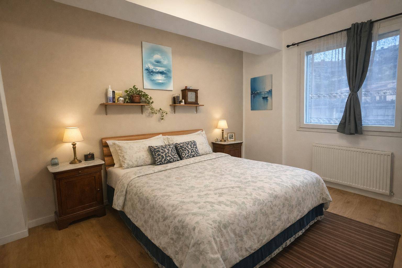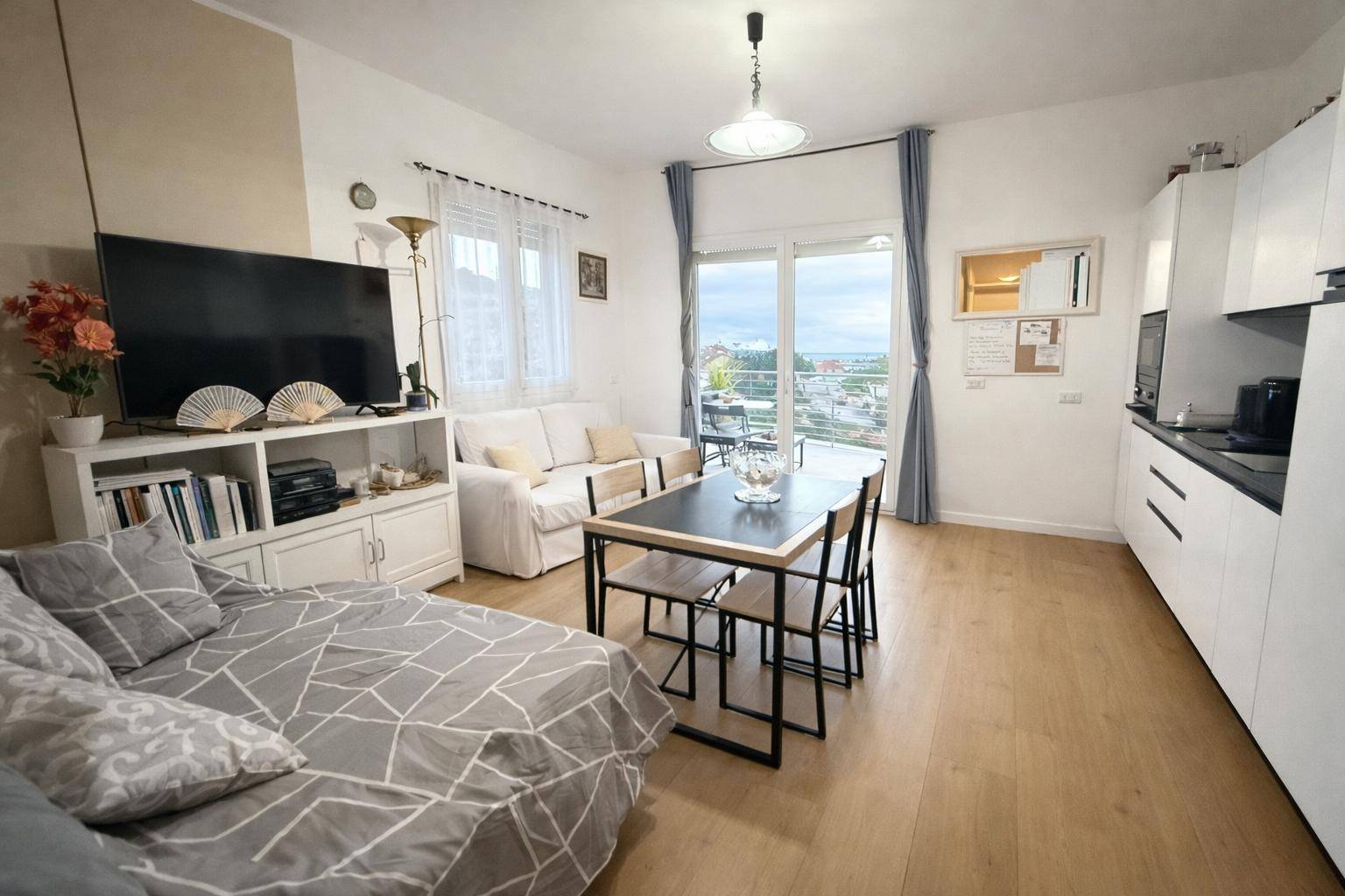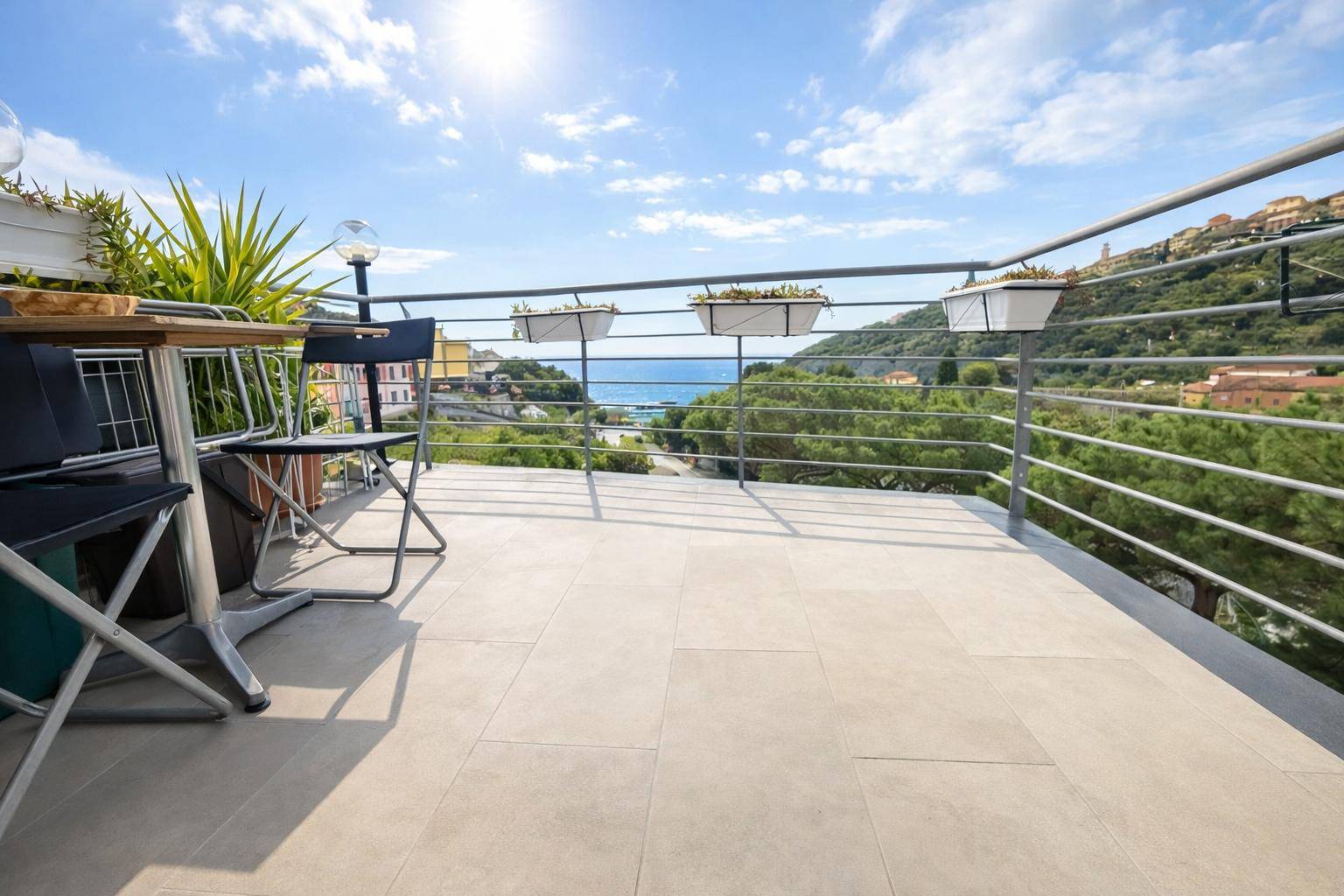 Internamente è composto da ingresso su corridoio, soggiorno con angolo cottura con vista mare, terrazzo vivibile, due camere da letto e bagno finestrato. Completa la proprietà una porzione di lastrico solare sovrastante l'appartamento con vista panoramica sul mare e sulla collina.