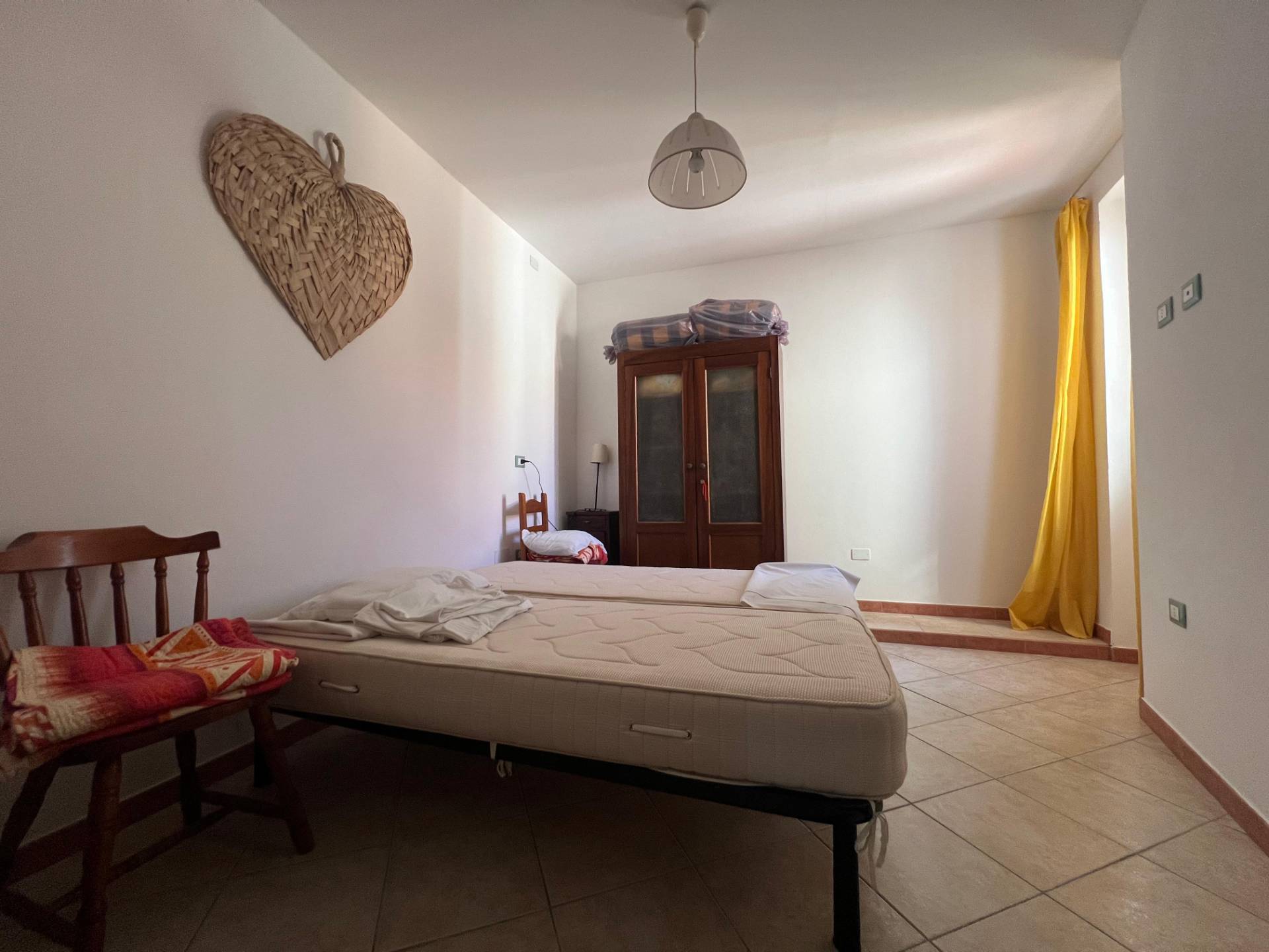 Il piano inferiore è caratterizzato da soggiorno con cucina a vista da cui si accede alla corte esterna, veranda con terrazzo con vista panoramica sulle colline e sul mare, due camere matrimoniali e un bagno finestrato con box doccia.