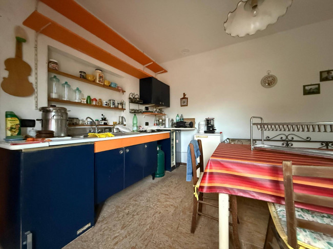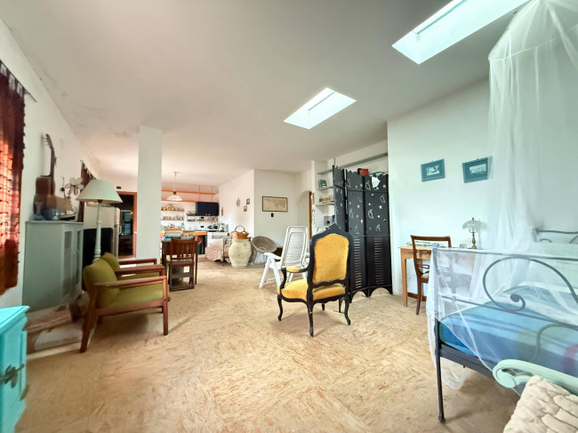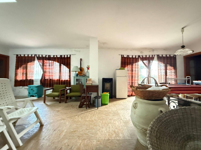 Grande zona giorno con cucina a vista, area pranzo e salotto, camera matrimoniale, sala da bagno con doccia e due ulteriori corpi adiacenti di ampia metratura, oggi allo stato grezzo e usati come magazzini.
