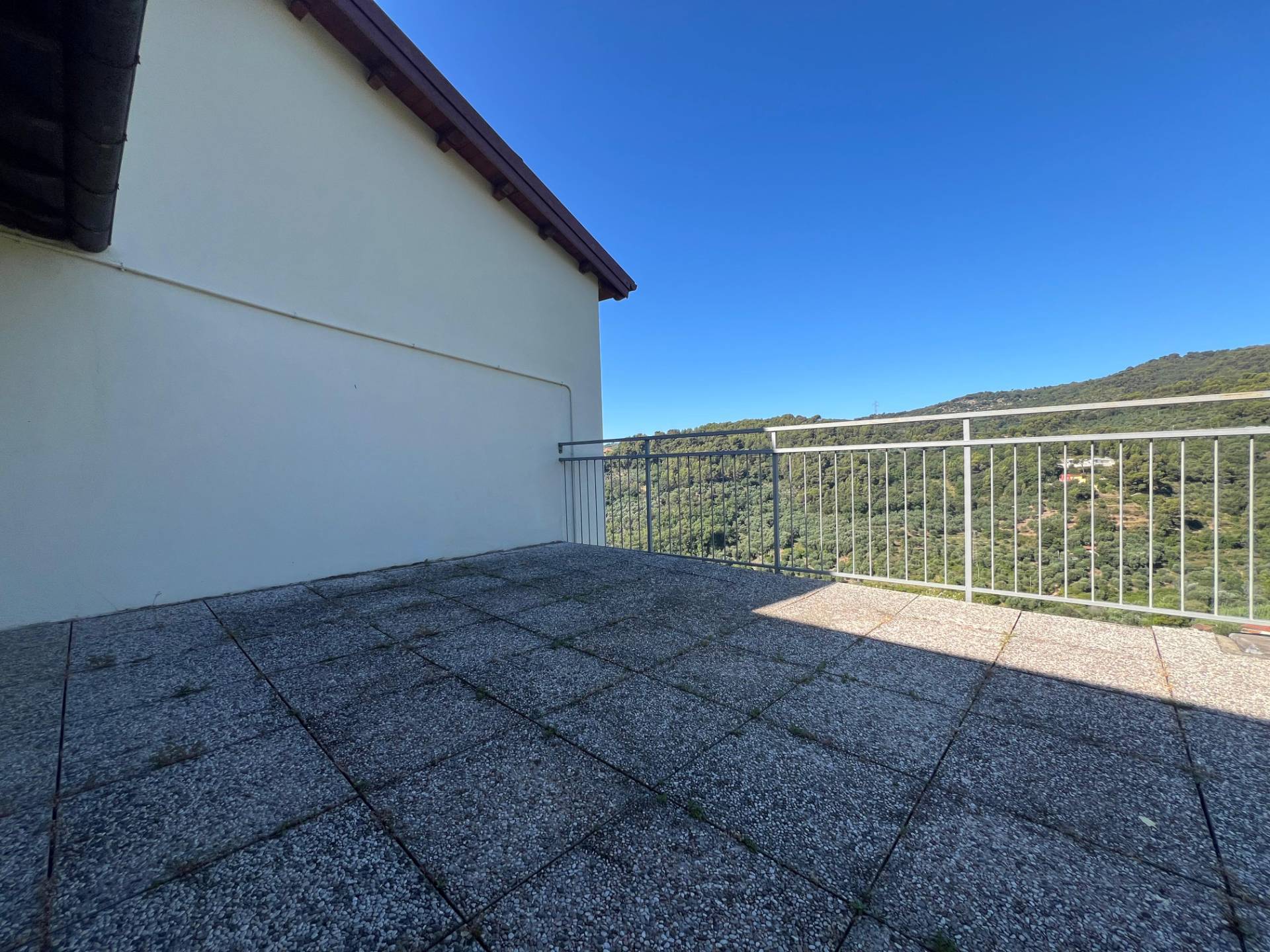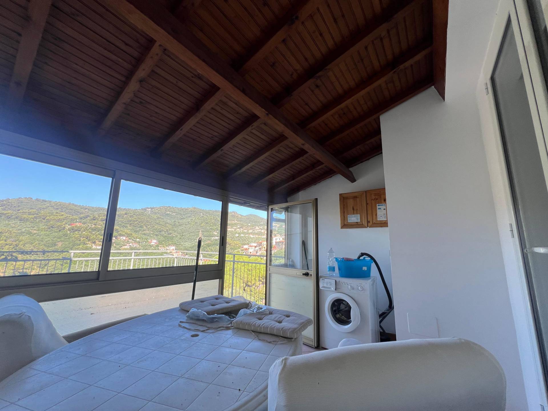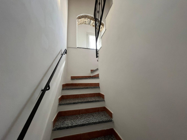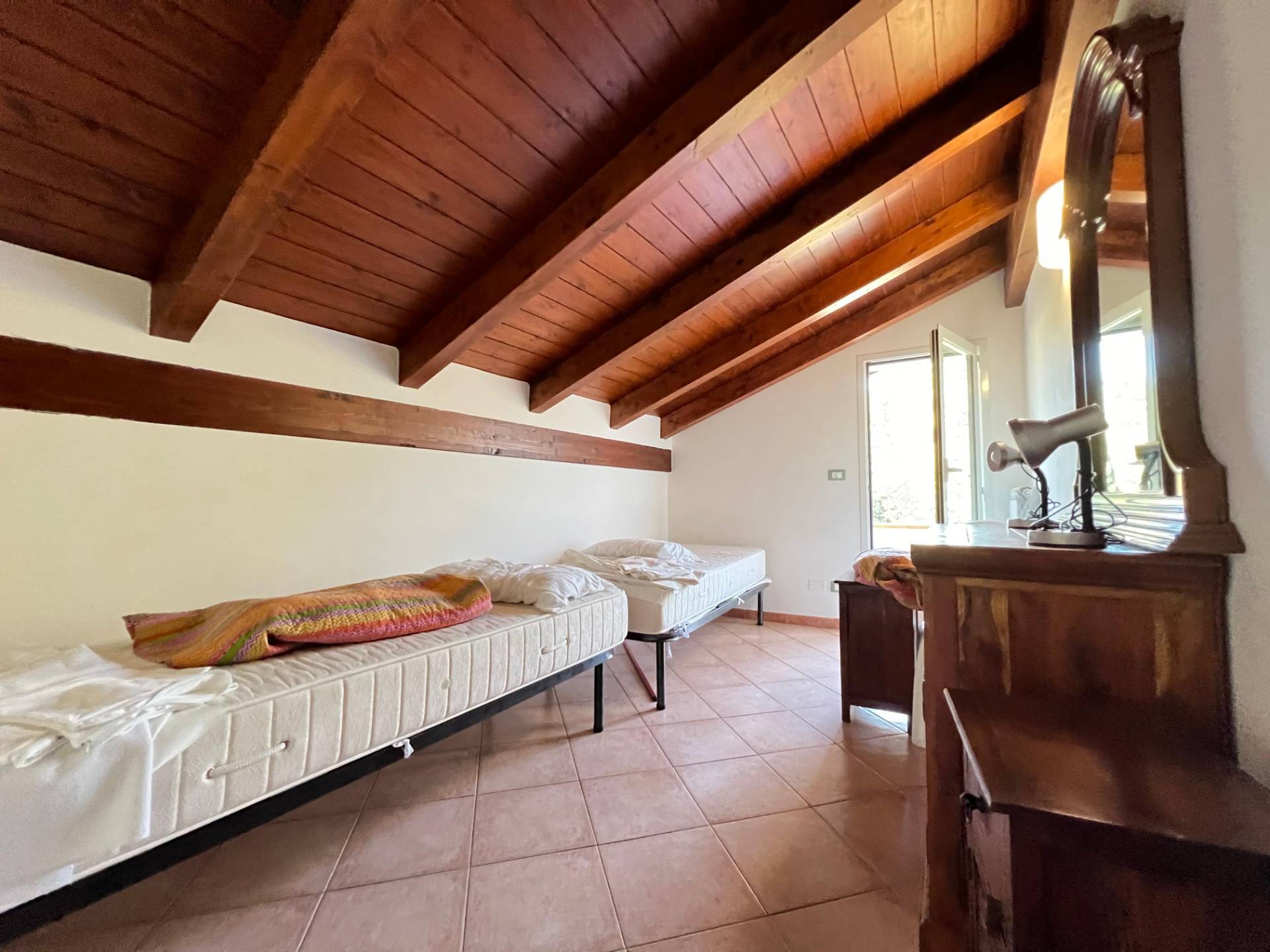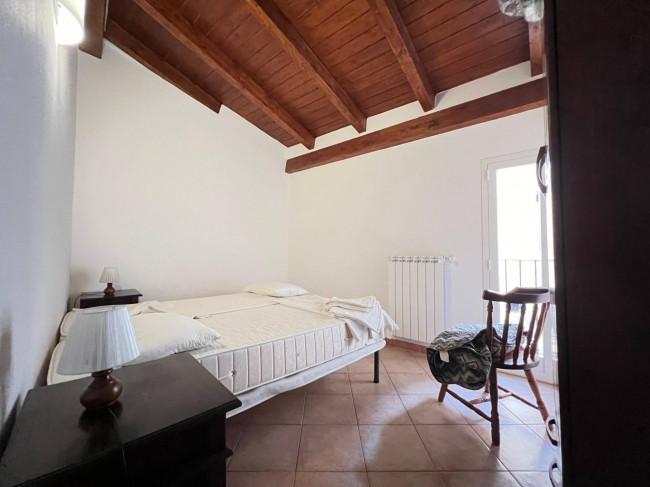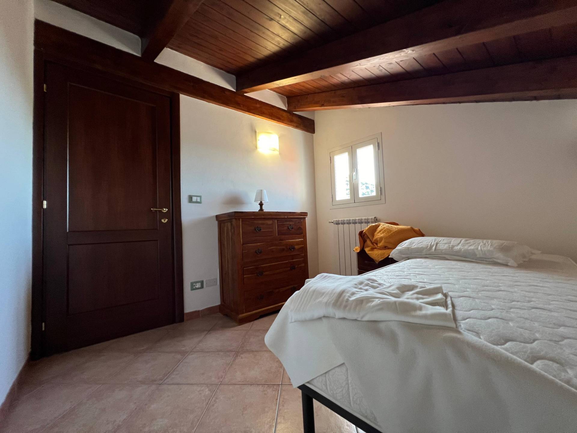 Il piano inferiore è caratterizzato da soggiorno con cucina a vista da cui si accede alla corte esterna, veranda con terrazzo con vista panoramica sulle colline e sul mare, due camere matrimoniali e un bagno finestrato con box doccia.