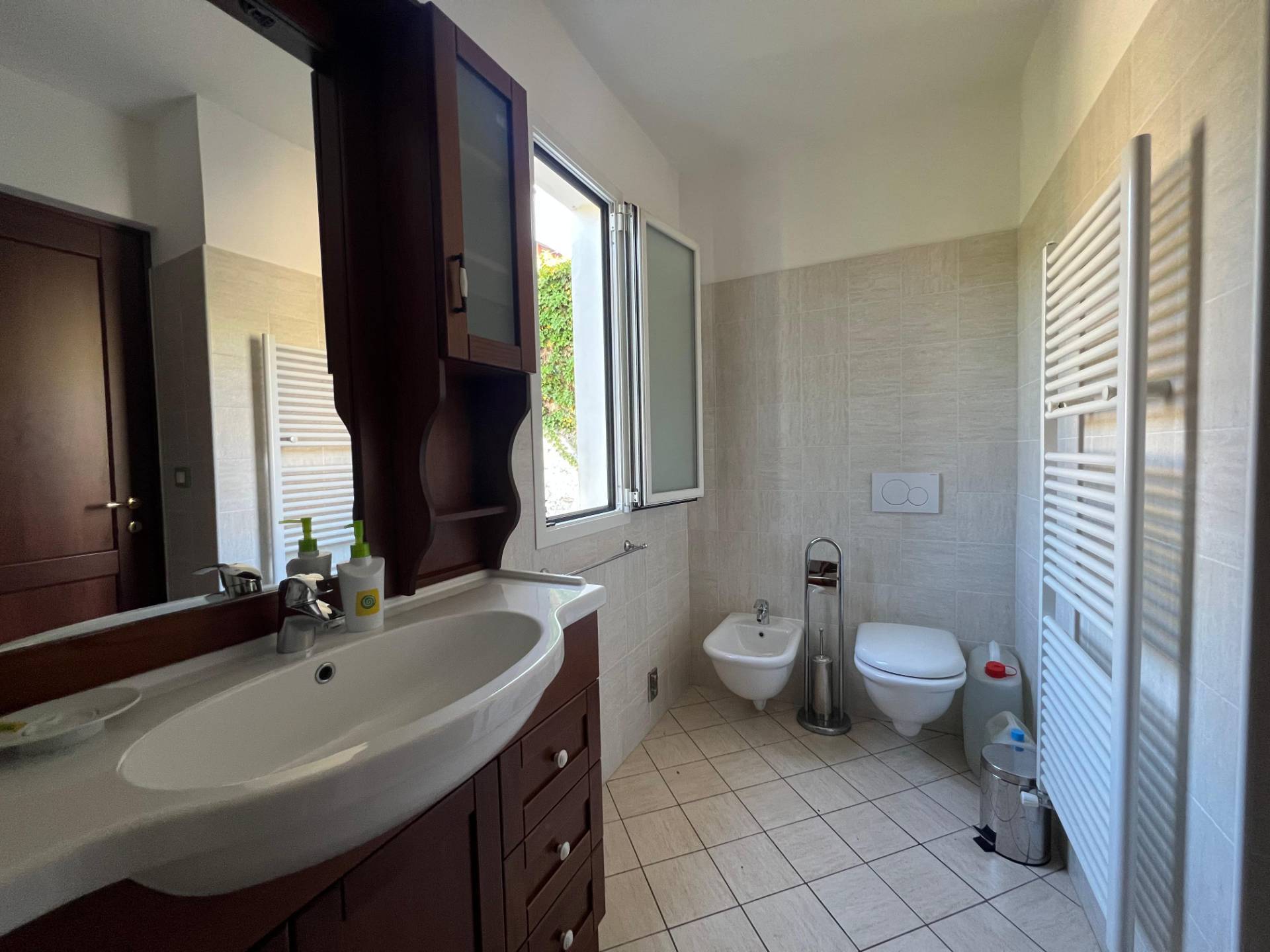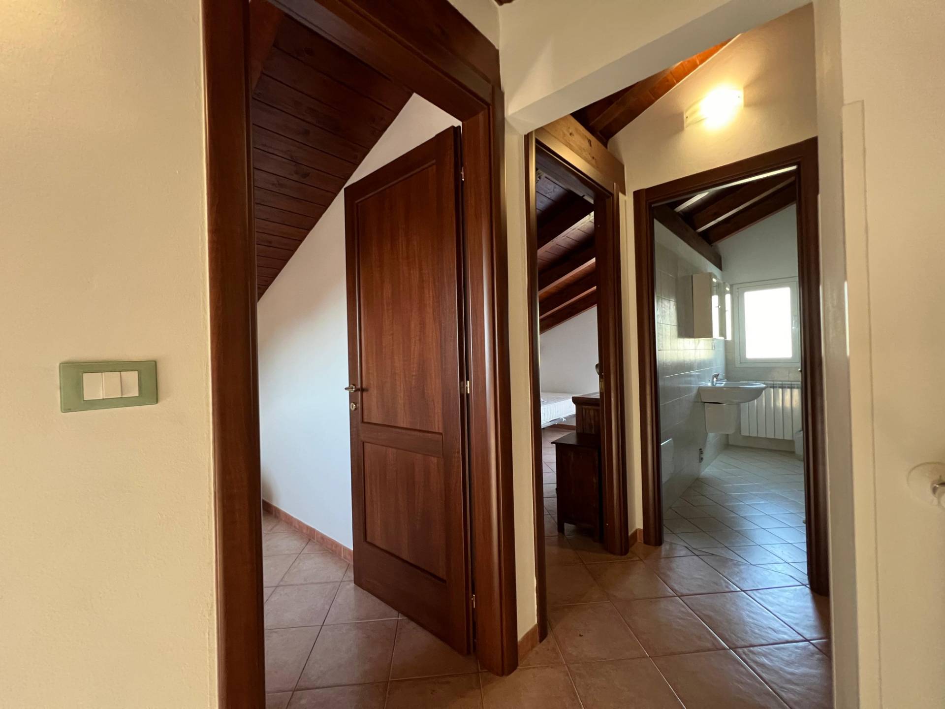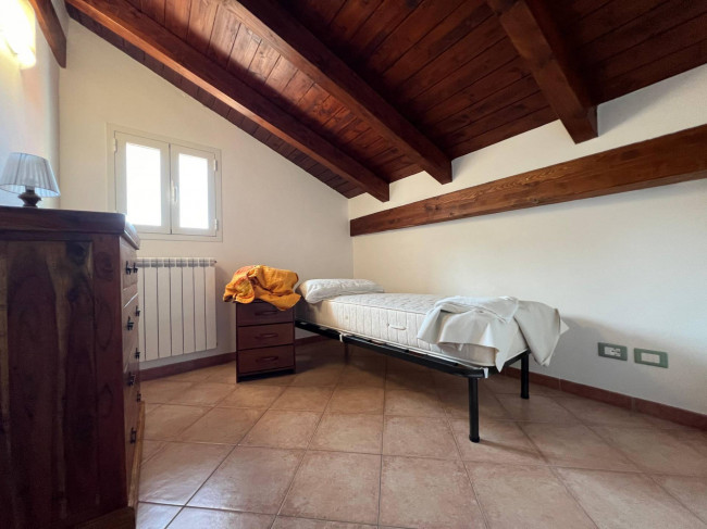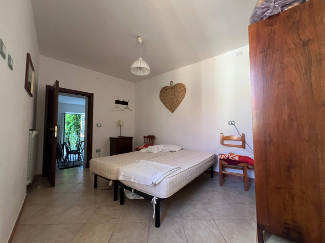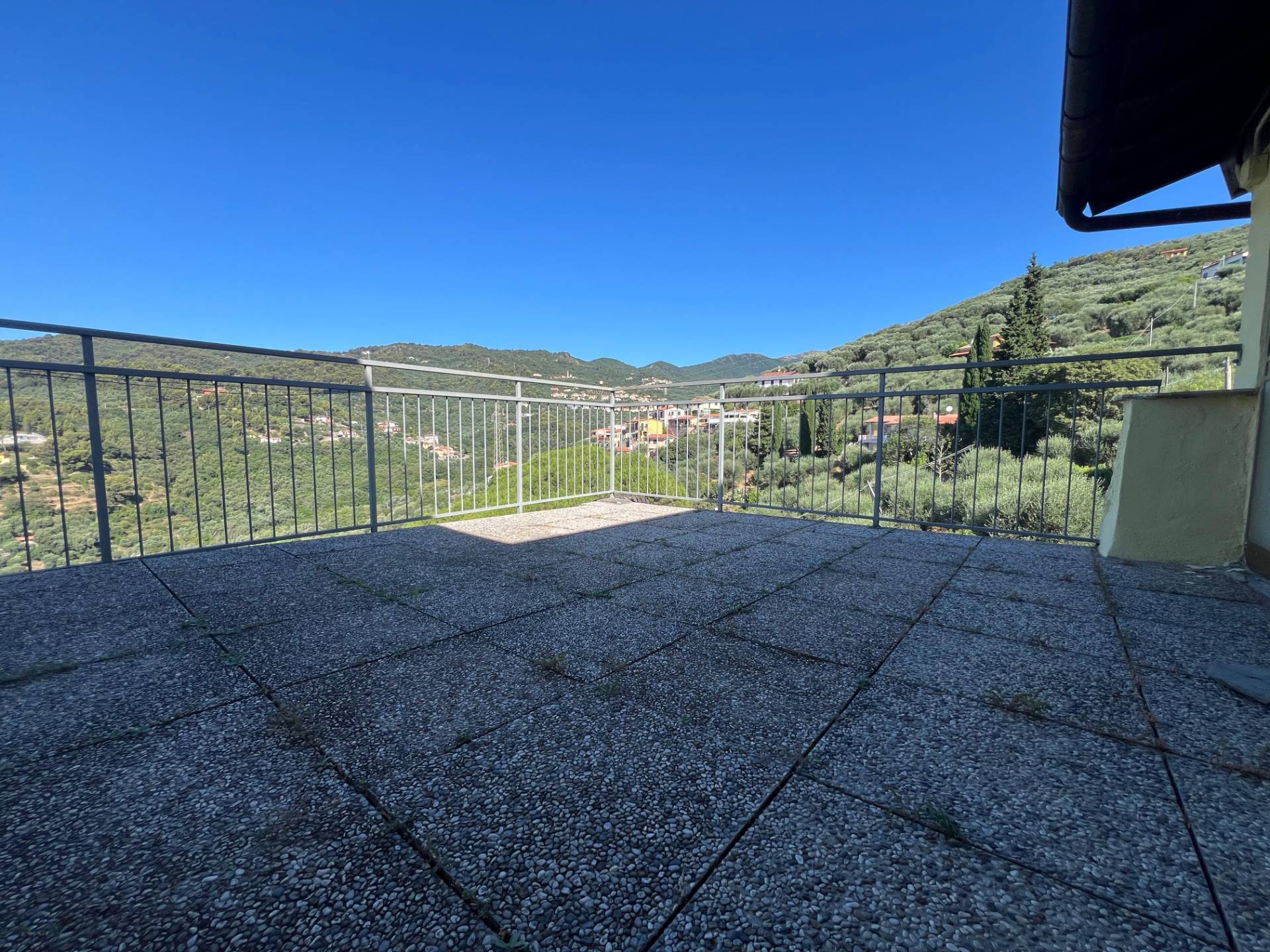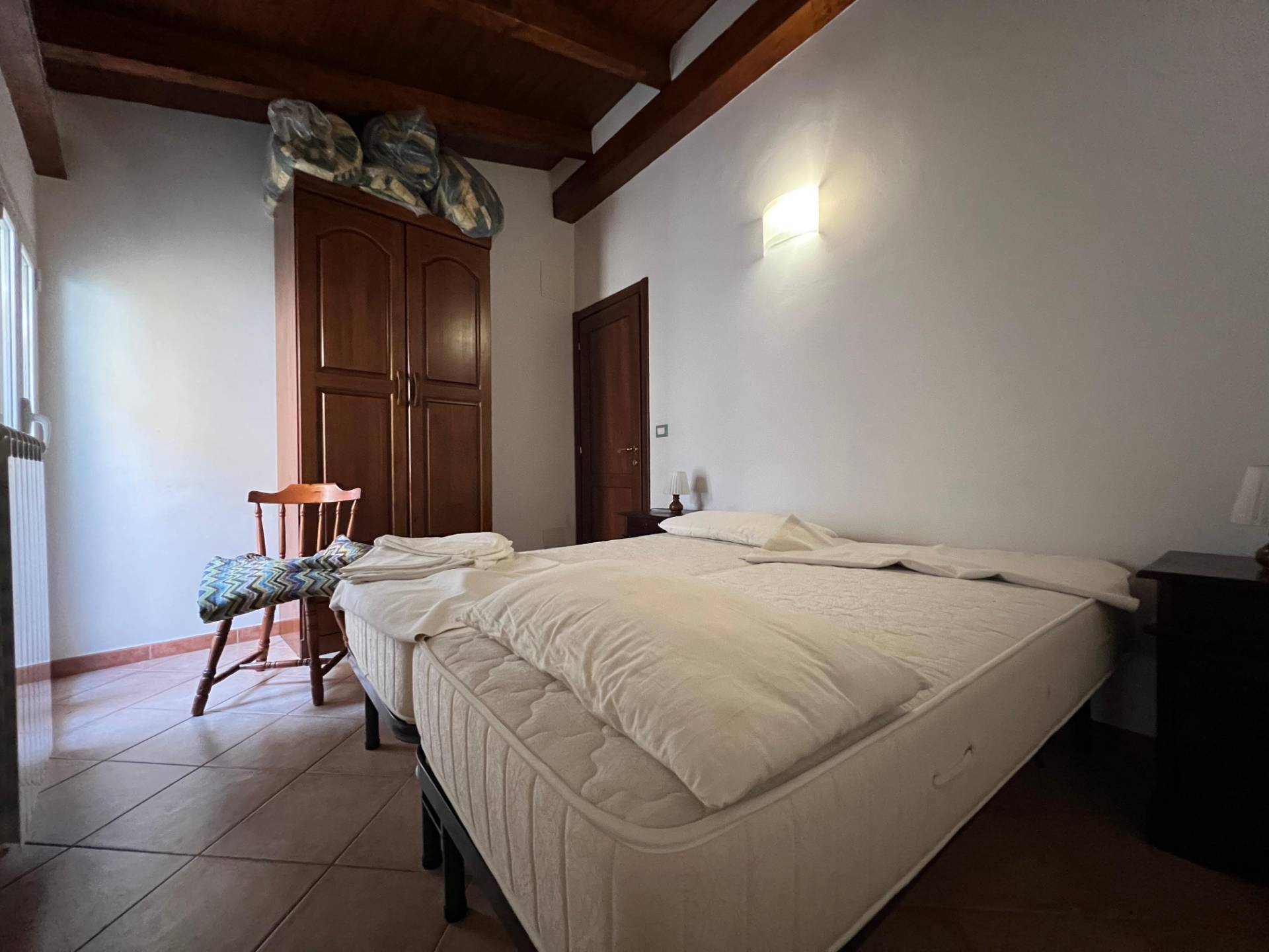 Il piano inferiore è caratterizzato da soggiorno con cucina a vista da cui si accede alla corte esterna, veranda con terrazzo con vista panoramica sulle colline e sul mare, due camere matrimoniali e un bagno finestrato con box doccia.