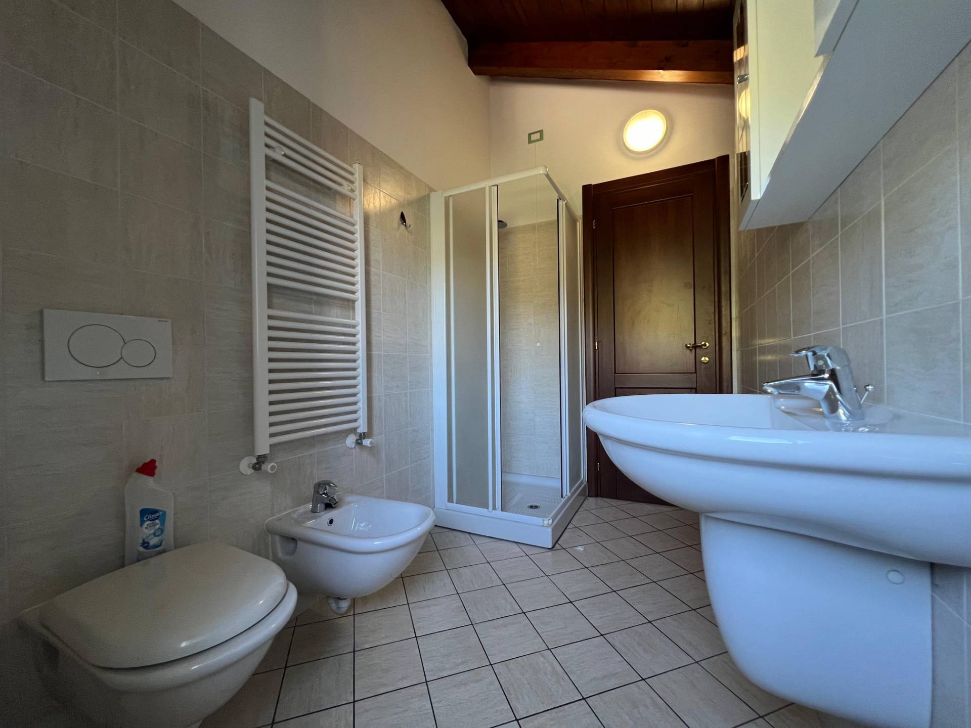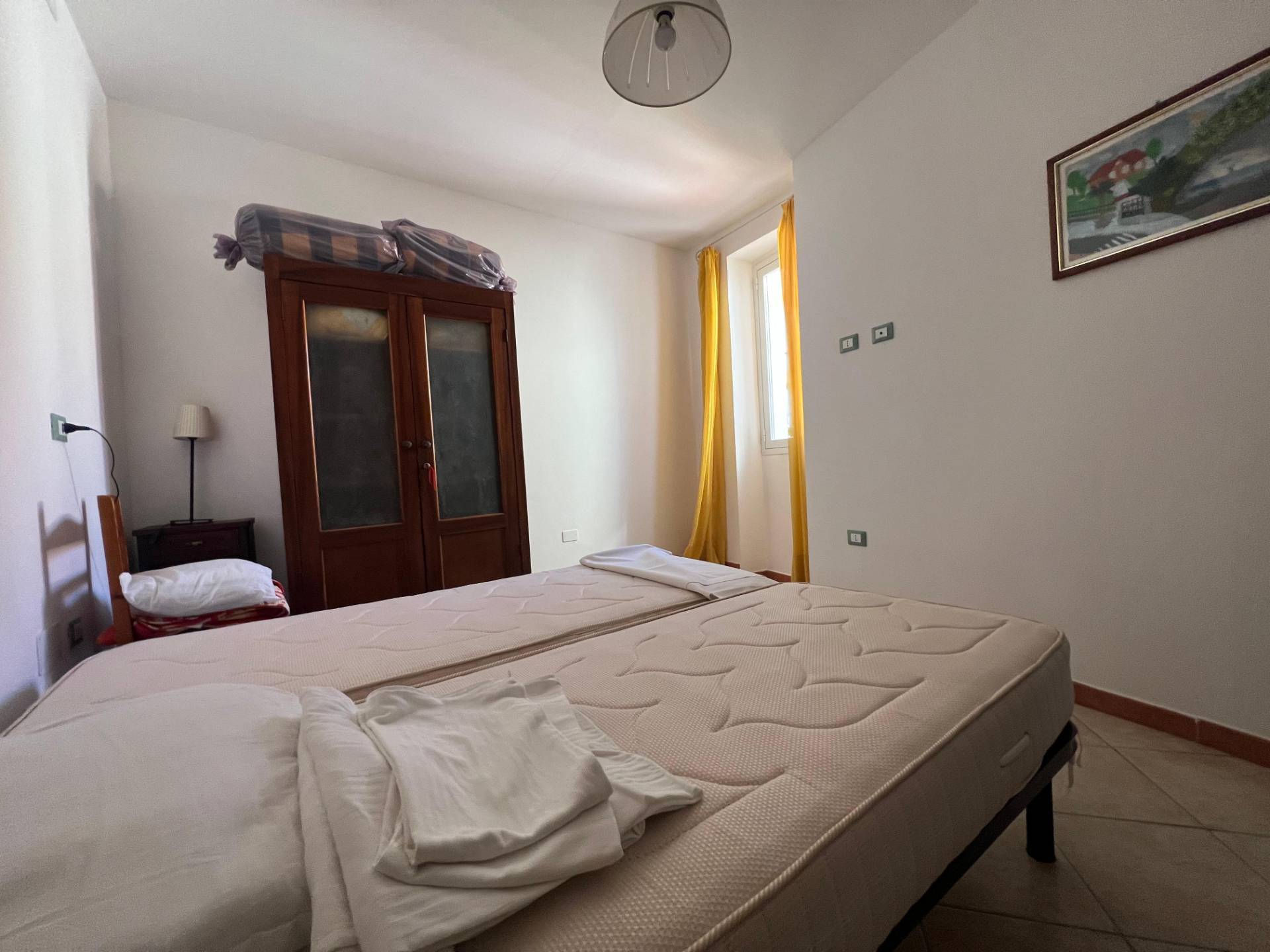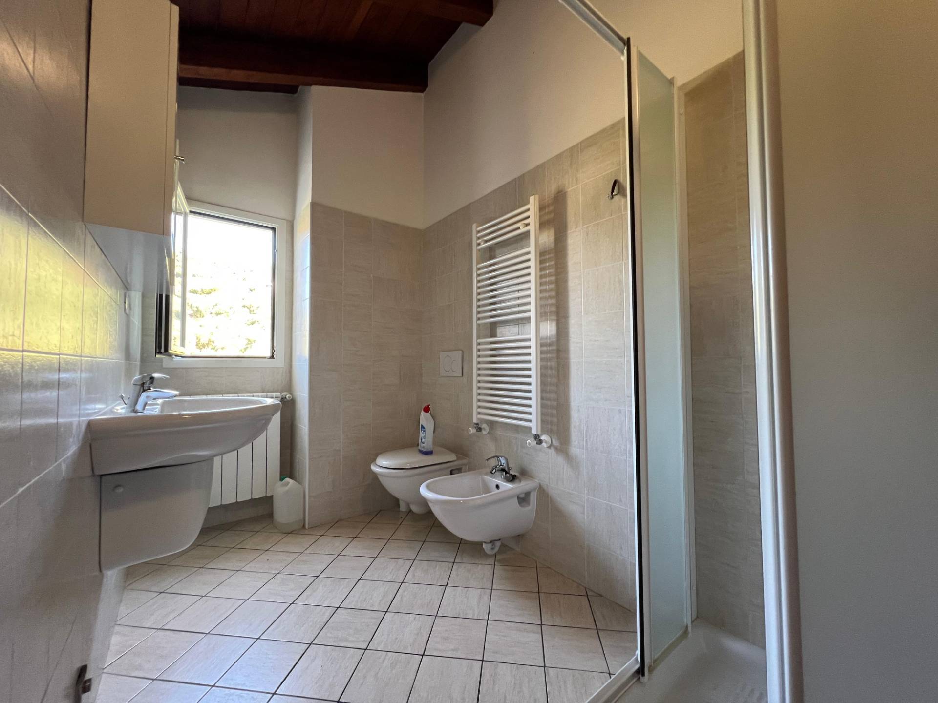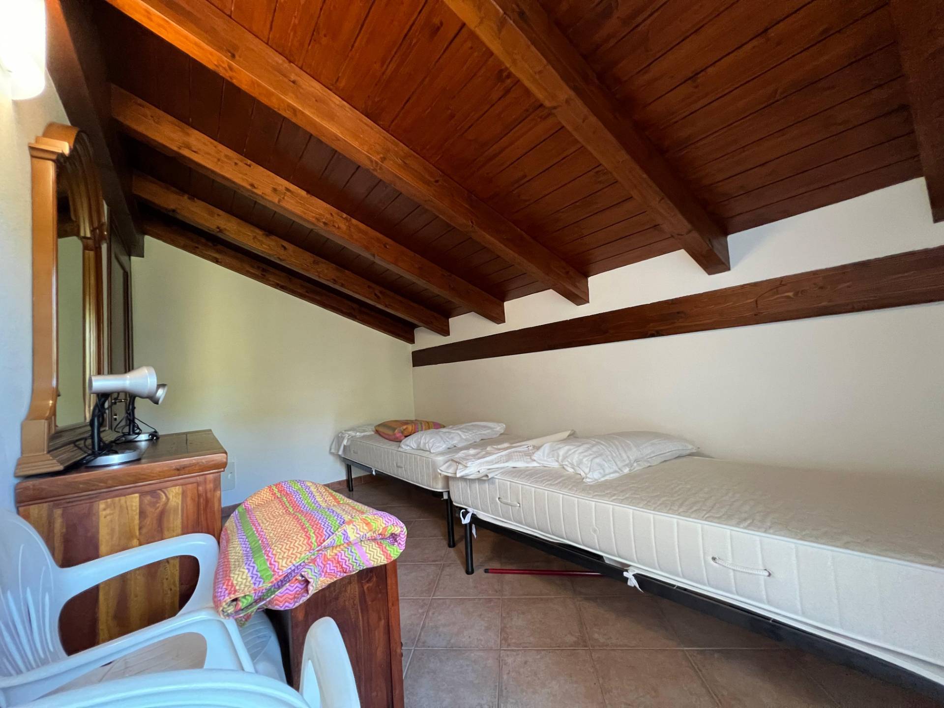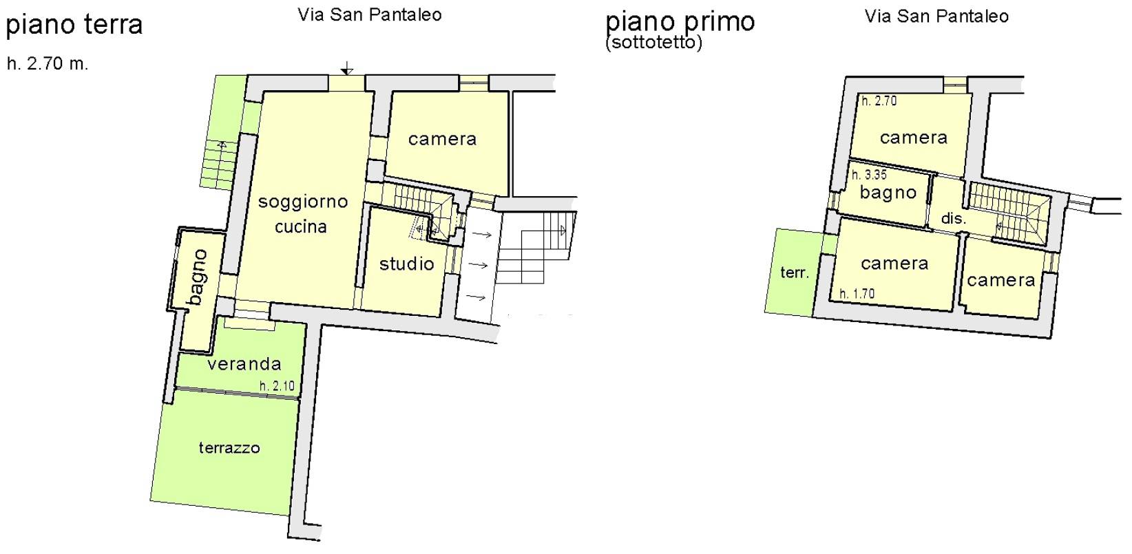 Il piano inferiore è caratterizzato da soggiorno con cucina a vista da cui si accede alla corte esterna, veranda con terrazzo con vista panoramica sulle colline e sul mare, due camere matrimoniali e un bagno finestrato con box doccia.