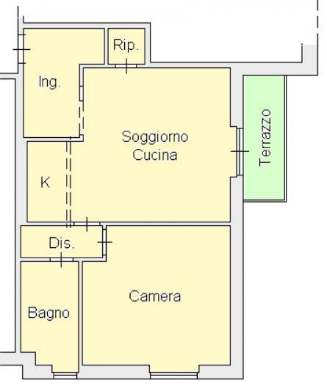 L'appartamento, con una superficie totale di 59 mq catastali, si presenta in discreto stato di conservazione ed è dotato di impianto di riscaldamento elettrico, mentre gli infissi sono in alluminio con vetro singolo. Esposizione Sud - Est, molto soleggiato.