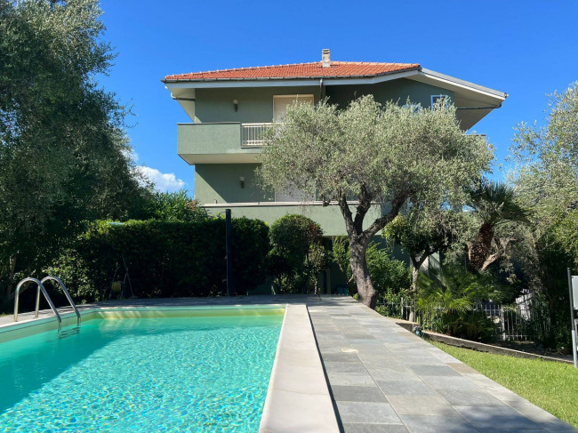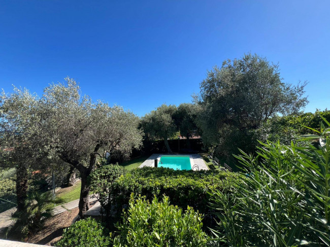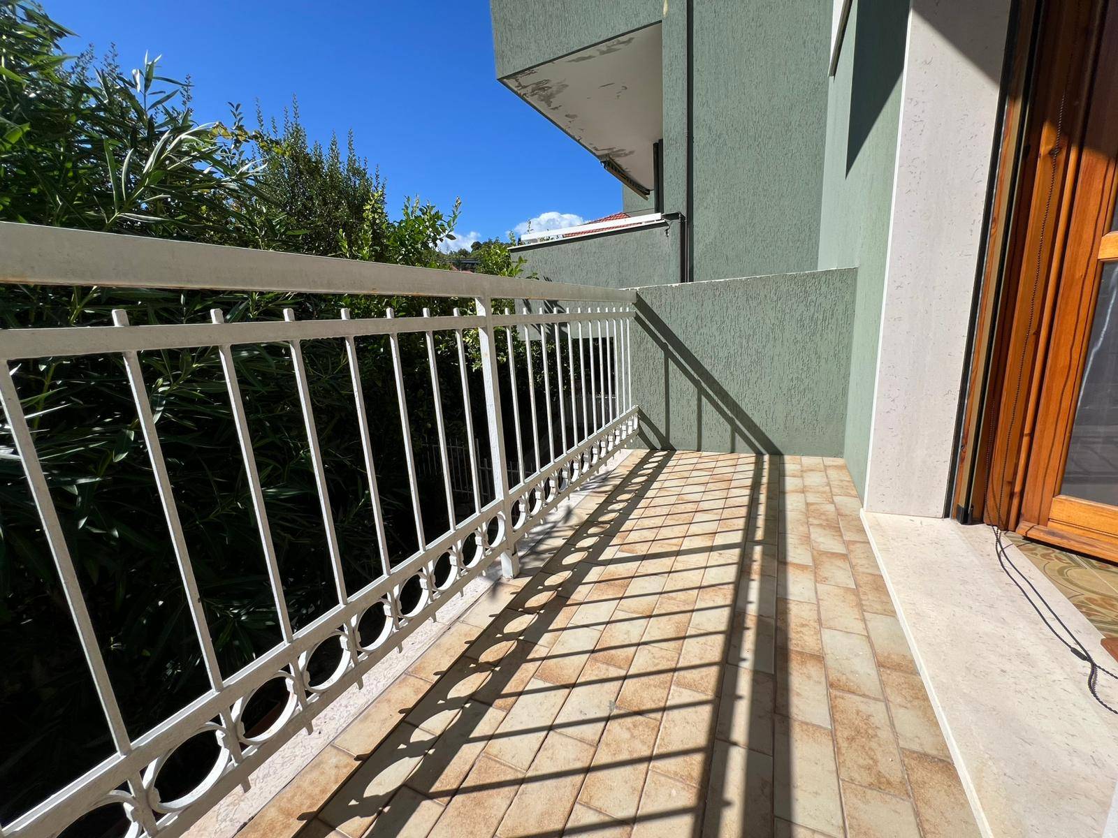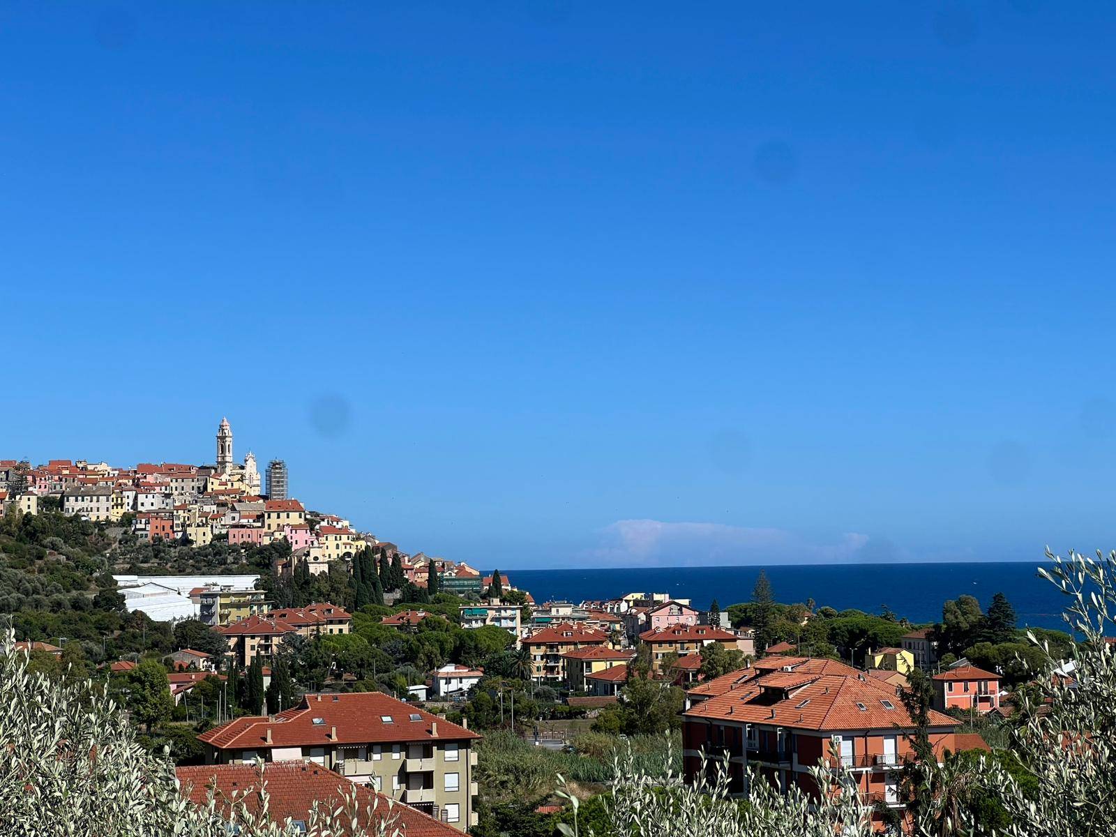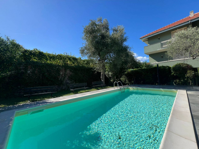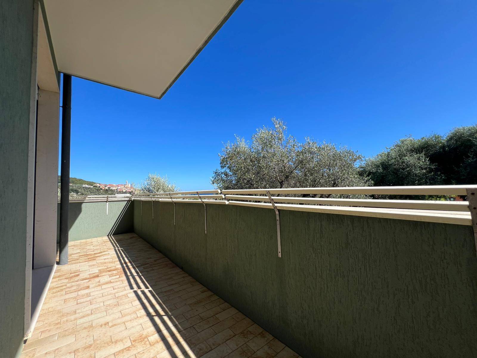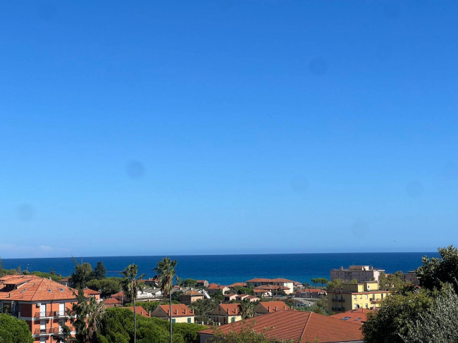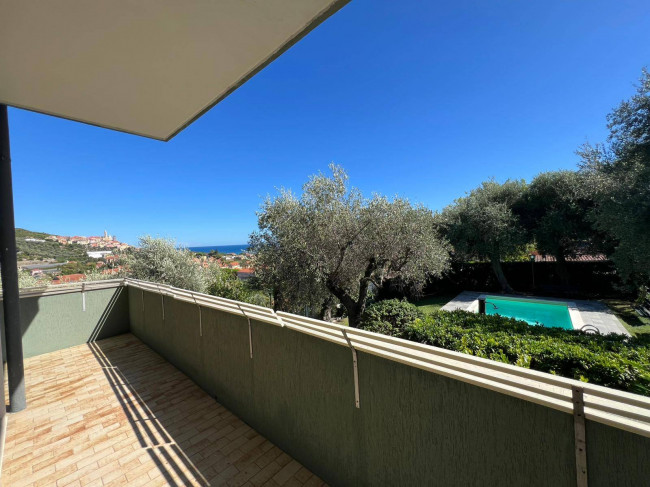 Trilocale con balconata con vista panoramica sul mare e sul borgo di Cervo, piscina condominiale e box auto.