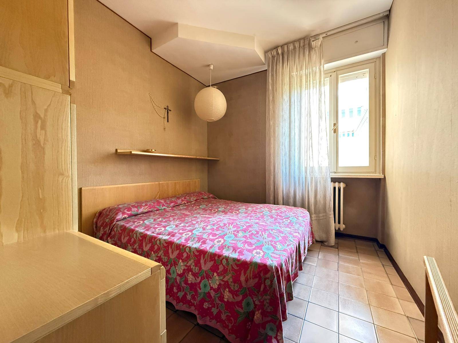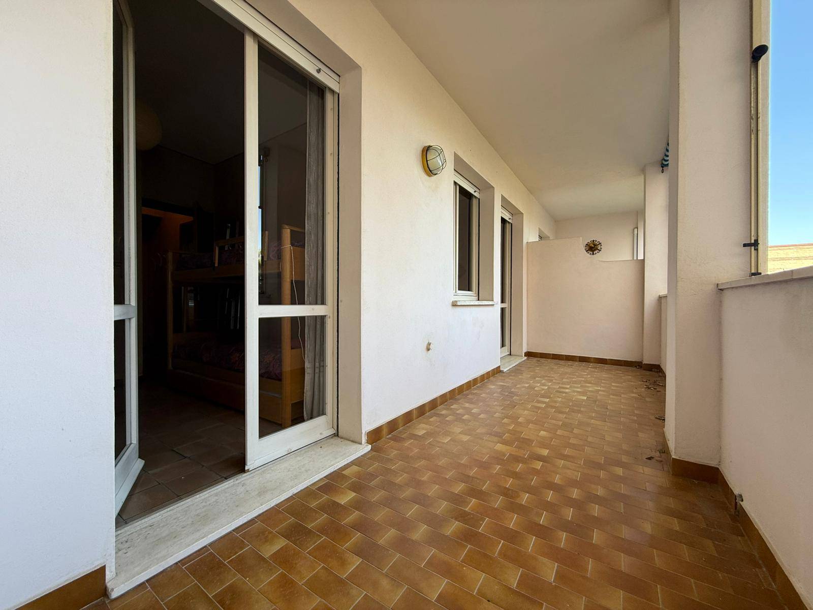 L'appartamento è internamente composto da ingresso su soggiorno dotato di angolo cottura, camera matrimoniale, grande camera singola, bagno finestrato con vasca ed ultima ma non per importanza, ampia "terrazza coperta" o "loggiato" di oltre 10 mq, estesa e profonda, accessibile dal soggiorno e dalla più piccola delle camere.
